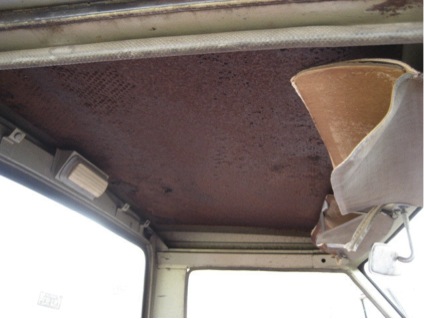 This is how the ceiling of the cab looked as we started on it. You can see some mix of rust and what is probably old flaking adhesive that held up the old ceiling panel. (oh and aged, sun baked, warped visors that are off now)My concern is the corners and inside edges if that is rust (and I don't like sanding above my head as all that junk rains down on me!)